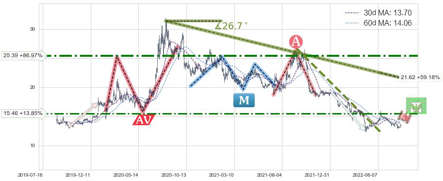 ♘ 阻力价格位25.39,可信任强度78.60%,距离最后交易2022-08-12形成的收盘价格13.58相差 +86.97%