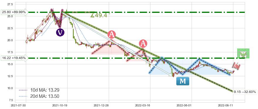 ♘ 阻力价格位16.22,可信任强度80.48%,距离最后交易2022-08-12形成的收盘价格13.58相差 +19.45%
