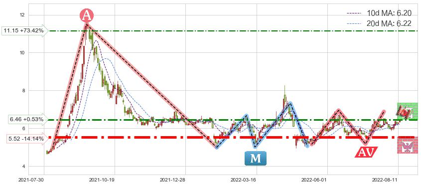 ♘ 阻力价格位11.15,可信任强度53.57%,距离最后交易2022-08-12形成的收盘价格6.43相差 +73.42%