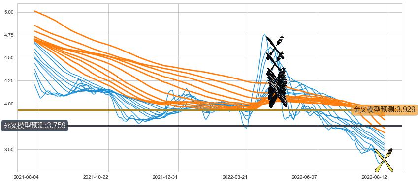 ➣ 34小时均线于(2022-04-20: 4.23)形成【死叉】基于【死叉历史模型】预测死叉后最低波谷价格: 3.907, 死叉后最低价格3.300,已经下跌超出预测最低波谷价格, 预期反弹