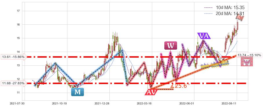 ♘ 支撑价格位13.61,可信任强度91.40%,距离最后交易2022-08-12形成的收盘价格16.18相差 -15.86%