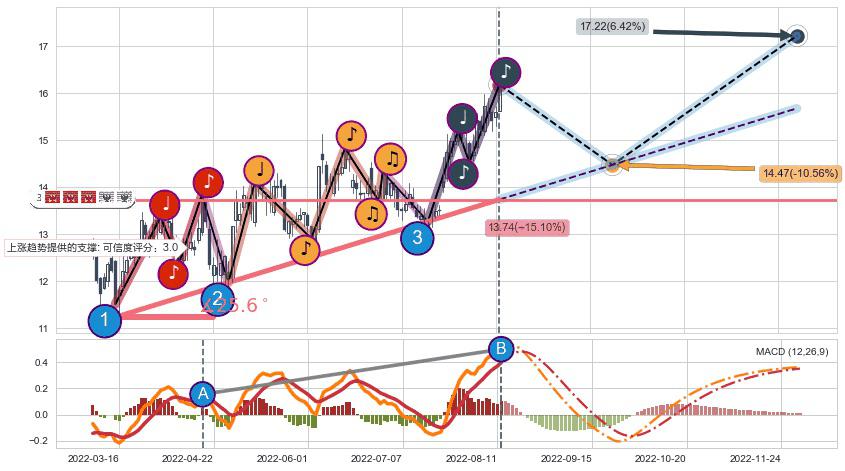 ♘ 在最后的上升阶段2022-03-15至2022-08-12存在 持续未破位的支撑位 ,支撑价格13.74,支撑可信任强度74.82%,其距离最后价格16.18相差 -15.10%