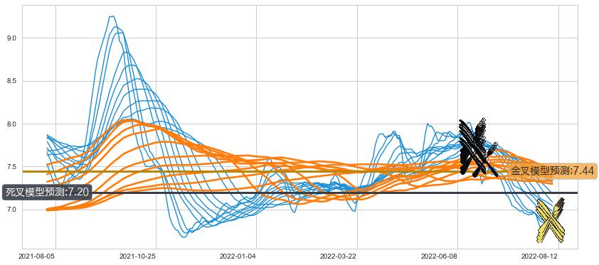 ➣ 80小时均线于(2022-06-17: 7.60)形成【死叉】基于【死叉历史模型】预测死叉后最低波谷价格: 6.99, 死叉后最低价格6.58,已经下跌超出预测最低波谷价格, 预期反弹