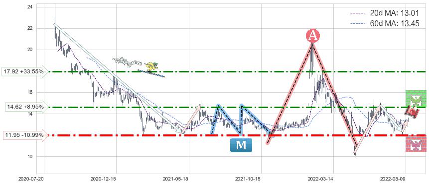 ♘ 阻力价格位14.62,可信任强度62.11%,距离最后交易2022-08-12形成的收盘价格13.42相差 +8.95%