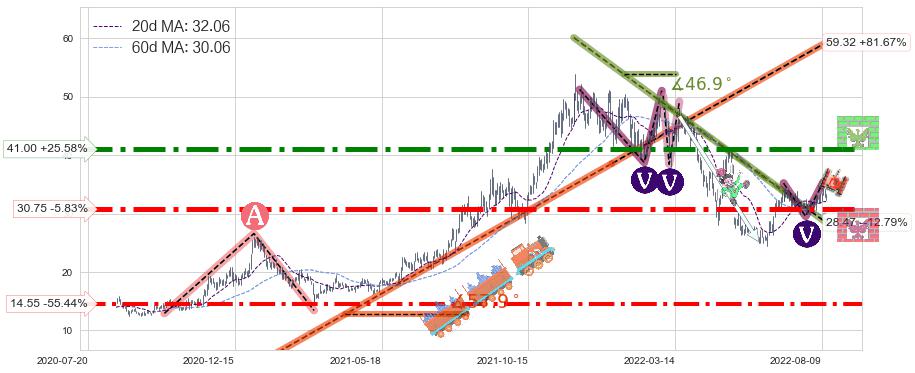 ♘ 阻力价格位41.00,可信任强度94.10%,距离最后交易2022-08-12形成的收盘价格32.65相差 +25.58%