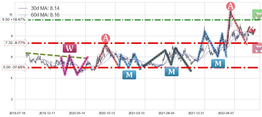 ♘ 支撑价格位7.32,可信任强度89.03%,距离最后交易2022-08-12形成的收盘价格8.02相差 -8.77%