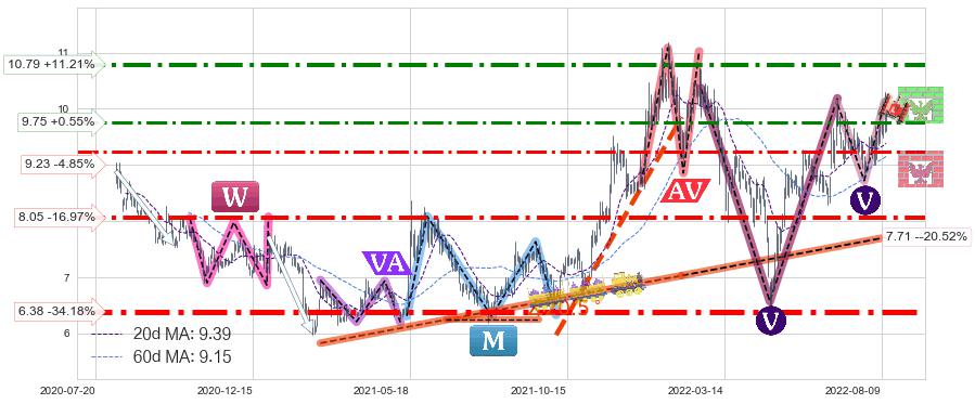 ♘ 支撑价格位9.23,可信任强度64.37%,距离最后交易2022-08-12形成的收盘价格9.70相差 -4.85%