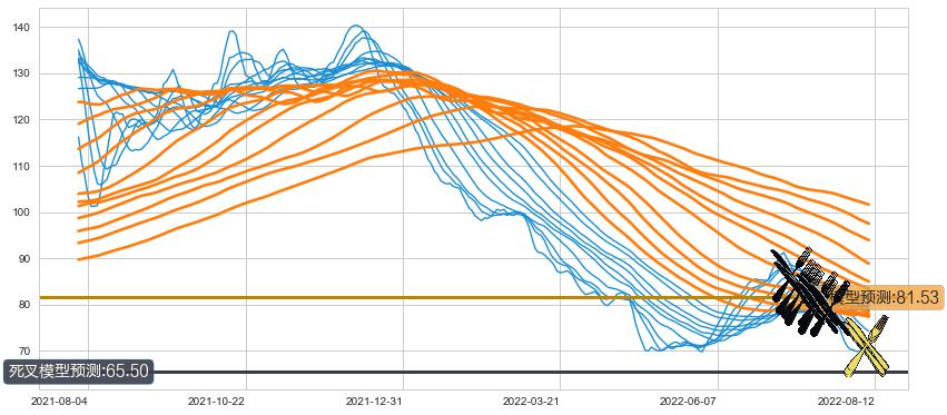 ➢ 34小时均线于(2022-07-13: 82.70)形成【死叉】基于【死叉历史模型】预测死叉后最低波谷价格: 73.64, 死叉后最低价格69.10,已经下跌超出预测最低波谷价格, 预期反弹