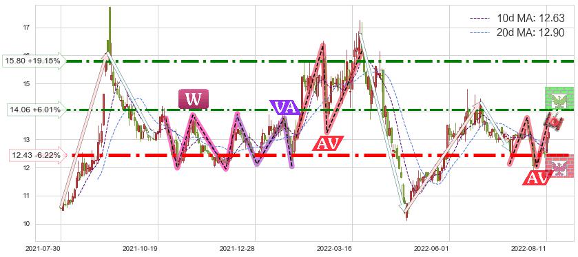 ♘ 阻力价格位14.06,可信任强度64.10%,距离最后交易2022-08-12形成的收盘价格13.26相差 +6.01%