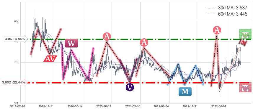 ♘ 支撑价格位3.002,可信任强度99.00%,距离最后交易2022-08-12形成的收盘价格3.870相差 -22.44%