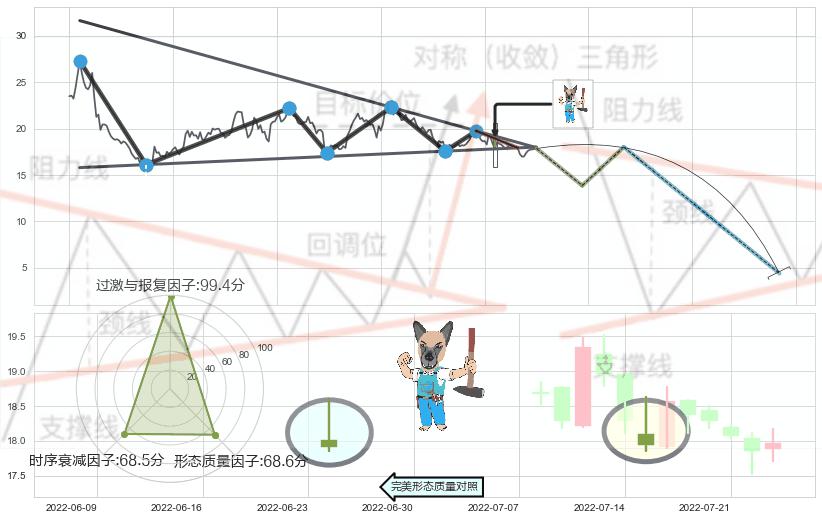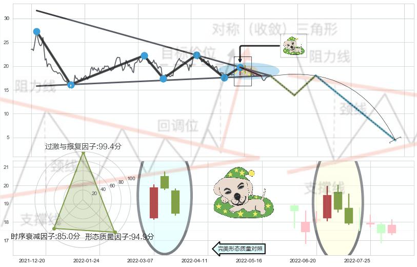 ➣ 【多空双方观望→争持→促使价格波动日益狭窄→空方打破攻守平衡点】对称三角形中继整理, 已在2022-08-01突破【支撑】颈线 17.92 →演变成下降通道