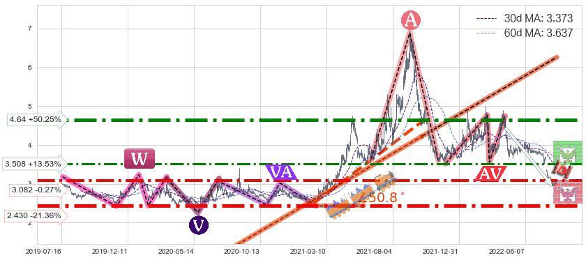 ♘ 阻力价格位4.64,可信任强度88.00%,距离最后交易2022-08-12形成的收盘价格3.090相差 +50.25%