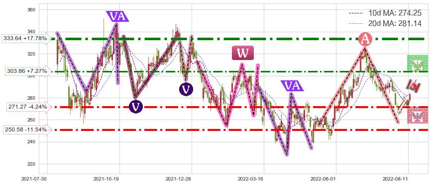 ♘ 支撑价格位250.58,可信任强度81.79%,距离最后交易2022-08-12形成的收盘价格283.27相差 -11.54%
