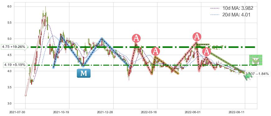 ♘ 阻力价格位4.75,可信任强度91.89%,距离最后交易2022-08-12形成的收盘价格3.980相差 +19.26%