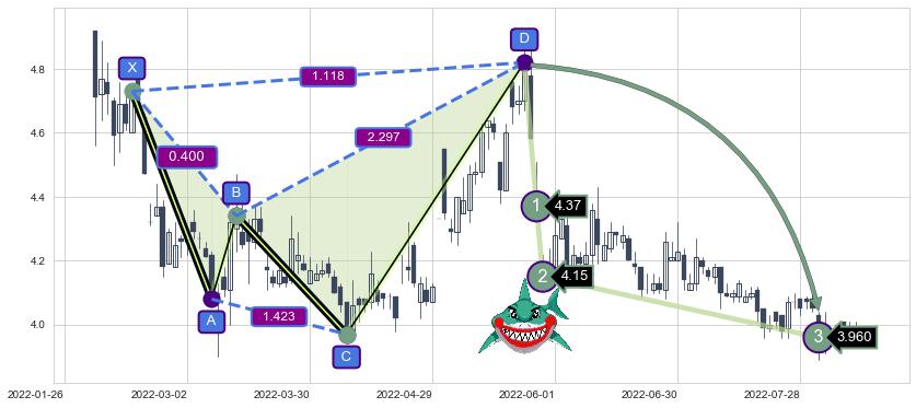 ➢ 谐波鲨鱼:d下跌已到达第❸目标:猜想支撑拉升 → 上涨 →【拐点】机会信号 → 大趋势均值回复