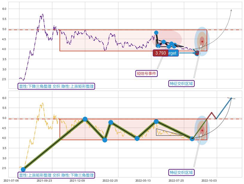 ➢ 【卖1】: 激进型 卖点→(2022-07-11: 4.11 )形成突破下降三角形整理【整理】形态