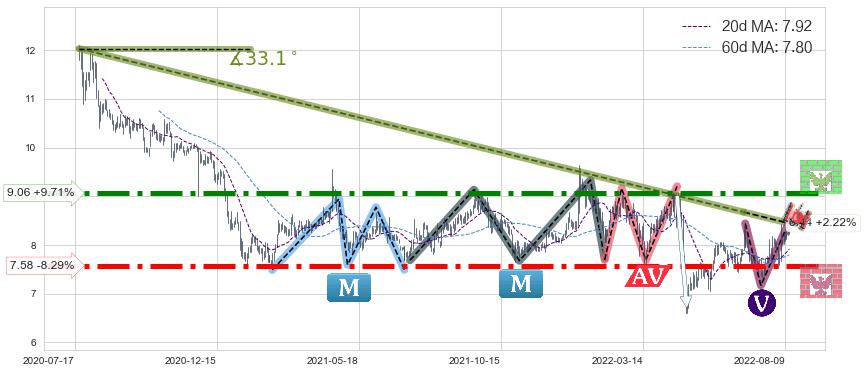 ♘ 支撑价格位7.58,可信任强度94.66%,距离最后交易2022-08-12形成的收盘价格8.26相差 -8.29%