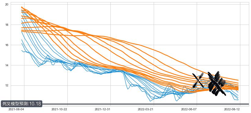 ➣ 60小时均线于(2022-07-08: 11.97)形成【死叉】基于【死叉历史模型】预测死叉后最低波谷价格: 10.45, 死叉后最低价格10.40,虽然已经到达预测最低波谷价格,但耗时间很短动能很强, 预期继续下跌