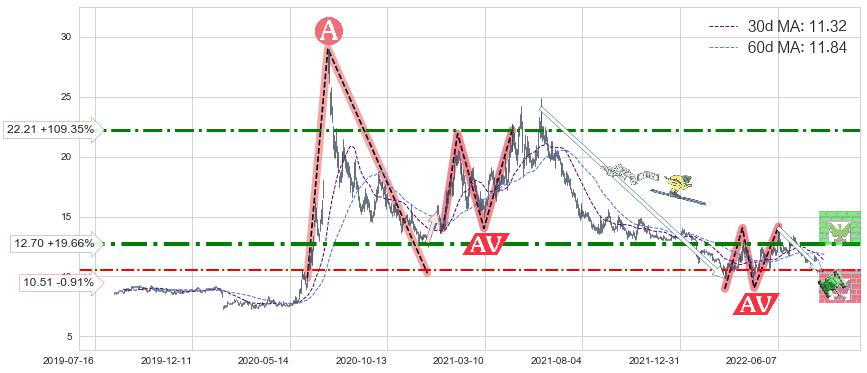 ♘ 阻力价格位22.21,可信任强度55.81%,距离最后交易2022-08-12形成的收盘价格10.61相差 +109.35%