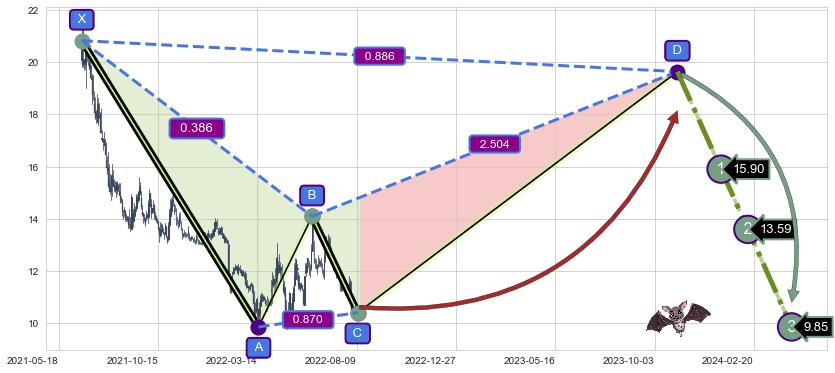 ➣ 谐波蝙蝠:猜想c点下沉接近b点后强支撑来临拉升上涨(均值回复)