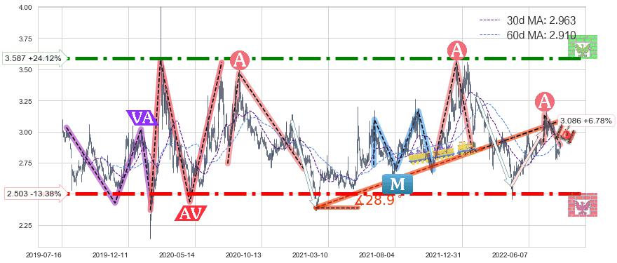 ♘ 阻力价格位3.587,可信任强度93.52%,距离最后交易2022-08-12形成的收盘价格2.890相差 +24.12%