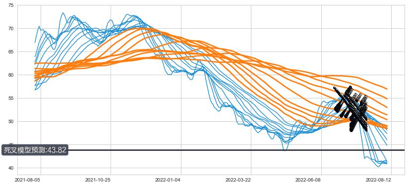 ➣ 60小时均线于(2022-07-14: 51.07)形成【死叉】基于【死叉历史模型】预测死叉后最低波谷价格: 42.29, 死叉后最低价格39.55,已经下跌超出预测最低波谷价格, 预期反弹