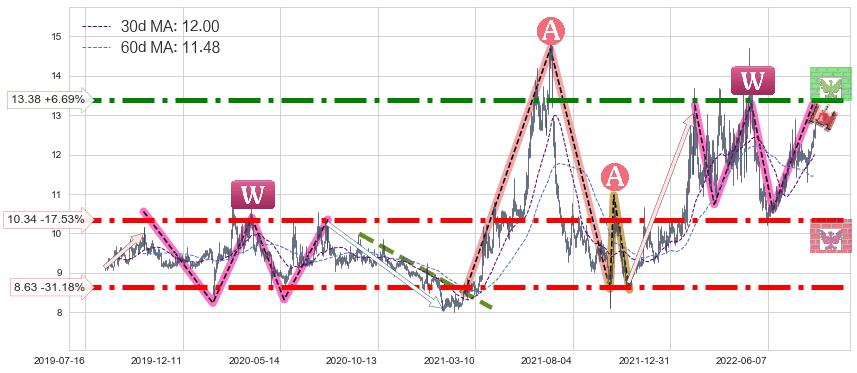 ♘ 支撑价格位10.34,可信任强度90.56%,距离最后交易2022-08-12形成的收盘价格12.54相差 -17.53%
