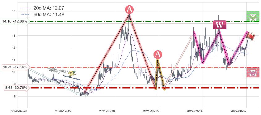 ♘ 阻力价格位14.16,可信任强度62.39%,距离最后交易2022-08-12形成的收盘价格12.54相差 +12.88%