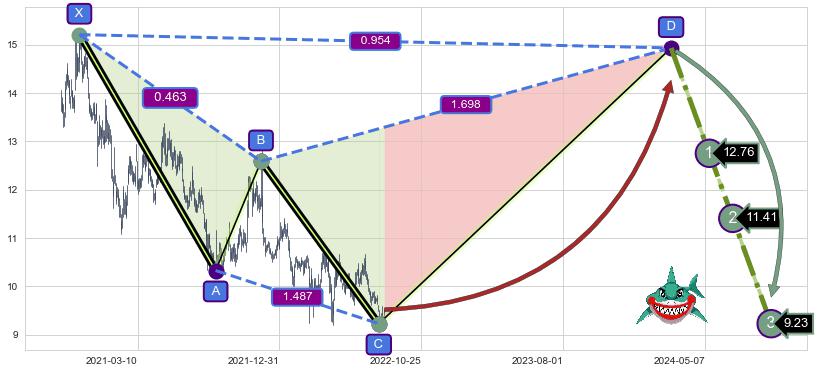➣ 谐波鲨鱼:b持续蓄力下跌击穿越过c:猜想报复性拉升 → 上涨 →【拐点】强支撑临近 → 大趋势均值回复