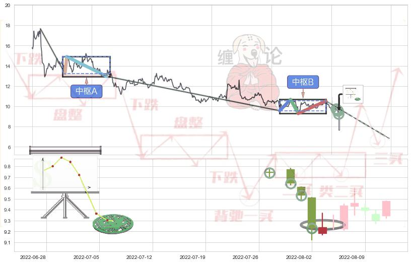 ➢ 【中枢B】:2022-03-09-2022-07-04,中枢由4笔构成,共78交易日, ZG=10.53, ZD=9.56