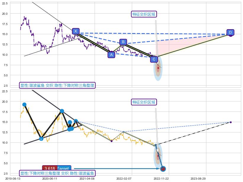 ➣ 双针探底 + 谐波鲨鱼下沉击穿c上涨拐点信号叠加后【目标达成率】中等,【看多】信号叠加【存续影响中等】