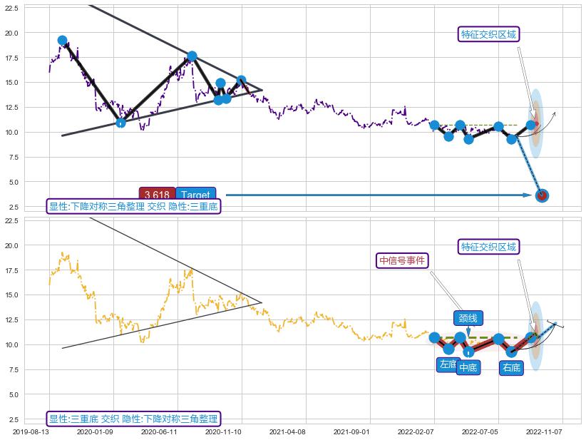 ➣ 仙人指路 + 下降对称三角整理临近target支撑拐点上涨信号叠加后【目标达成率】极低,【看多】信号叠加【存续影响极大】