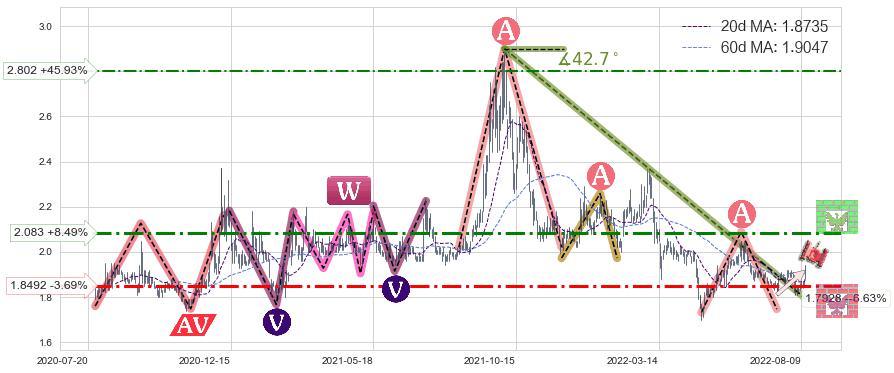 ♘ 阻力价格位2.083,可信任强度63.00%,距离最后交易2022-08-12形成的收盘价格1.9200相差 +8.49%