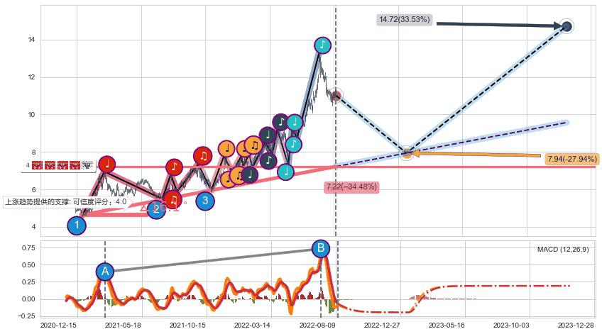 ♘ 支撑价格位6.35,可信任强度96.94%,距离最后交易2022-08-12形成的收盘价格11.02相差 -42.40%