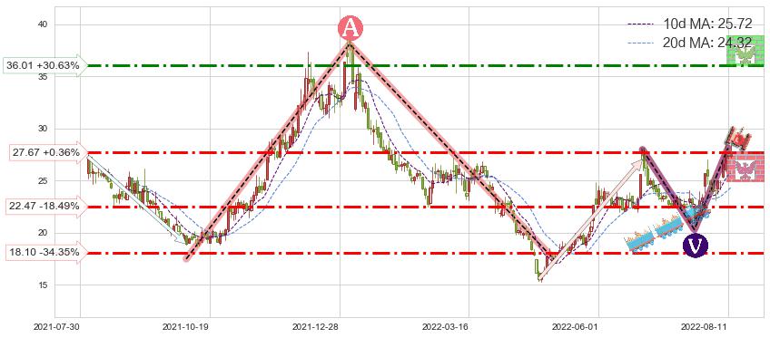 ♘ 支撑价格位22.47,可信任强度67.00%,距离最后交易2022-08-12形成的收盘价格27.57相差 -18.49%