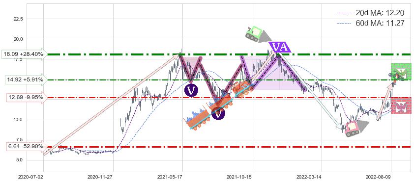 ♘ 阻力价格位14.92,可信任强度48.76%,距离最后交易2022-08-12形成的收盘价格14.09相差 +5.91%