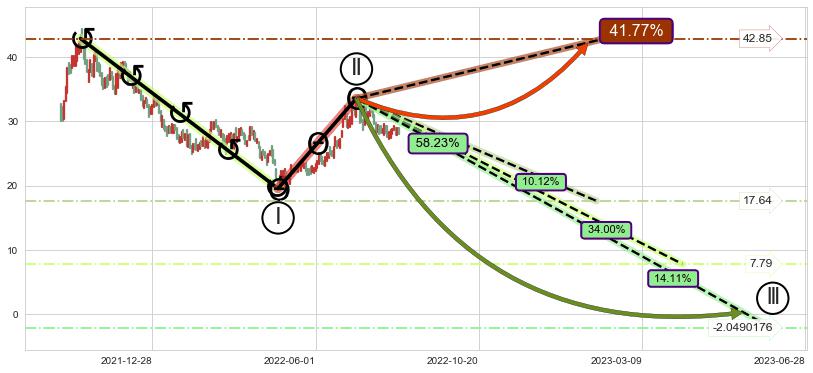 ➣ D点拟合预测价格41.75,距离最后交易收盘价格28.29相差 +47.59%