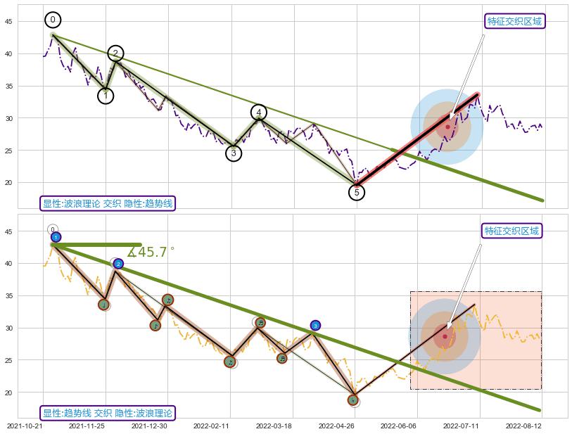 从2021-10-27至2022-05-19,共包含136个交易日,阶段股价下跌-53.59%,阶段股价变动位移路程比: 1 : 6,下跌趋势角度: 45.7