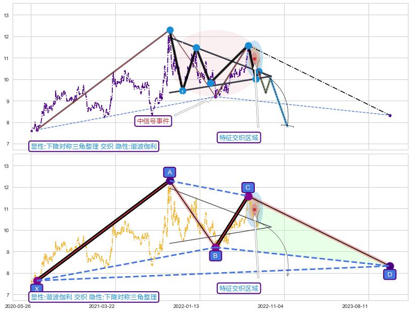 ➢ 下降对称三角整理属【中级别信号事件】谐波伽利属【长级别信号事件】中长周期组合信号事件,中长事件长度比40.23%
