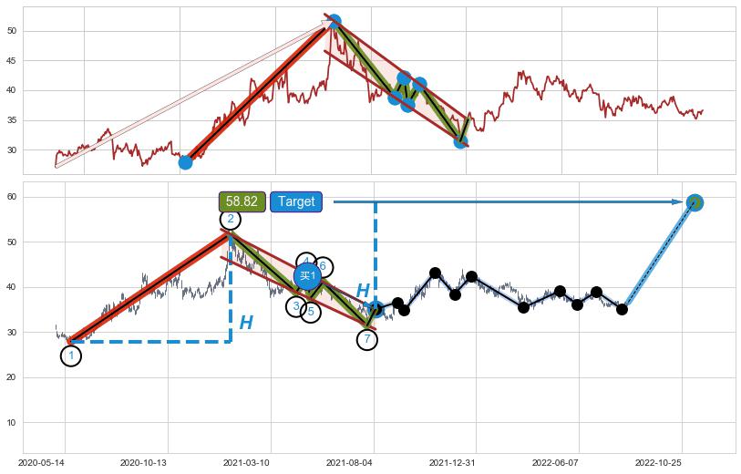 ➣ AI预测: 假定反转启动后, 第❶目标位置(2023-12-08, 40.52)