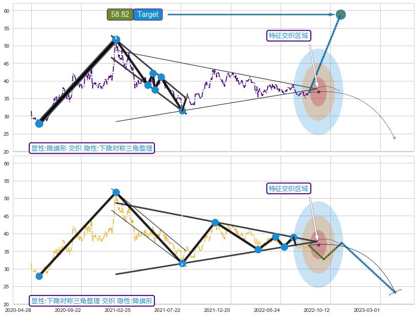 ➢ 下降对称三角整理支撑破位转换阻力下跌 🔜 降旗形临近target阻力拐点下跌 综合量化分数:41.93 【偏空】