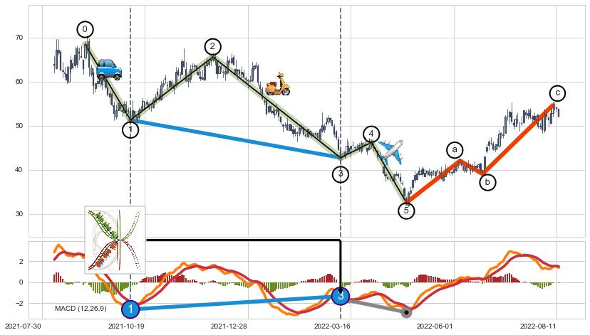 ➣ 波浪理论:猜想达到c点后小反弹终止反转下跌 → 下跌 → 【拐点】临近 → 阶段均值回复结束后继续大周期趋势跟踪