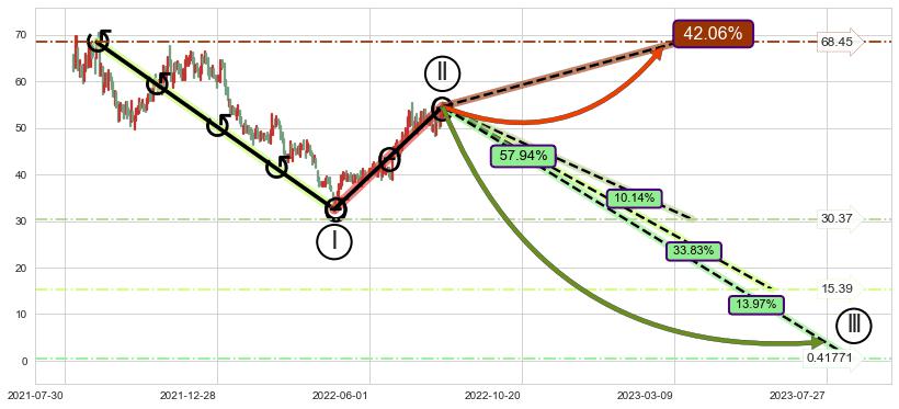 ➣ 调整浪已超过预测的c点位置,后续大趋势循环浪继续下跌概率57.94%,谨慎做多
