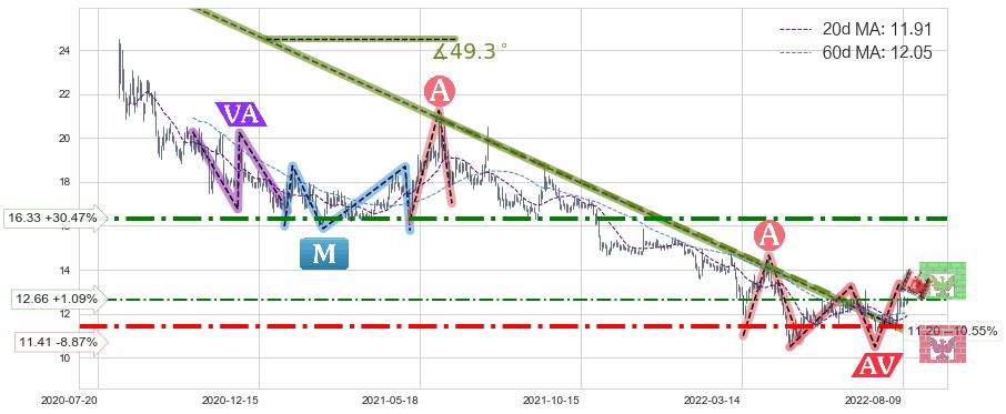 ♘ 支撑价格位11.41,可信任强度72.16%,距离最后交易2022-08-12形成的收盘价格12.52相差 -8.87%