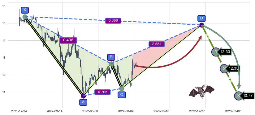 ➣ 未完成【蝙蝠】形态起点X: 2021-12-21, 已到达C点: 2022-07-15, 预测最终D点: 2022-12-20, 共244交易日