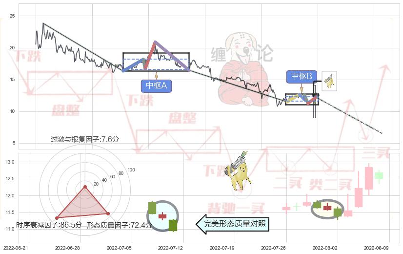 ➣ 【中枢B】:2022-05-24-2022-08-04,中枢由6笔构成,共52交易日, ZG=12.22, ZD=11.90
