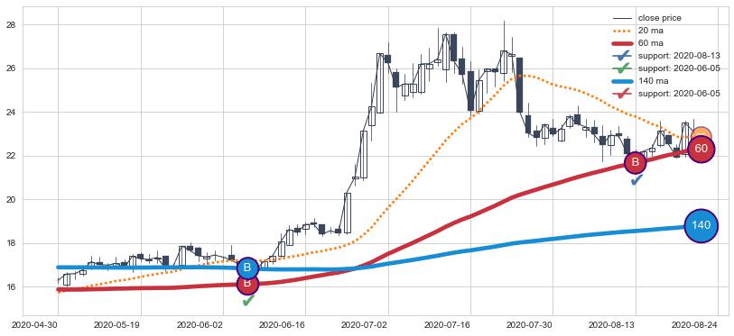 ➣ 70小时均线于(2022-07-29: 21.51)形成【死叉】基于【死叉历史模型】预测死叉后最低波谷价格: 18.92, 死叉后最低价格20.37,尚未达到预测最低波谷价格, 预期继续下跌