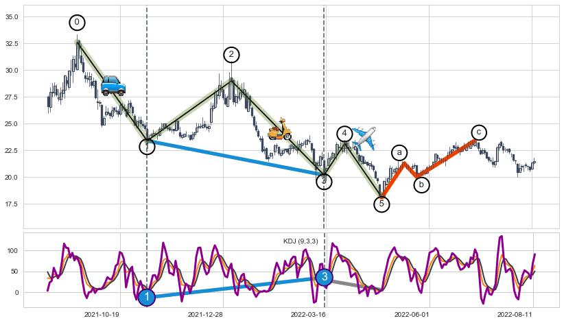 ➢ 波浪理论:猜想达到c点后小反弹终止反转下跌 → 下跌 → 【拐点】临近 → 阶段均值回复结束后继续大周期趋势跟踪