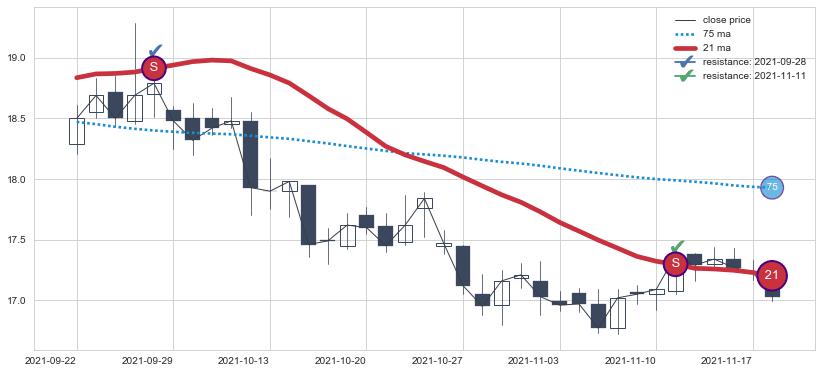 ➣ 40小时均线于(2022-07-19: 13.89)形成【死叉】基于【死叉历史模型】预测死叉后最低波谷价格: 12.69, 死叉后最低价格13.34,尚未达到预测最低波谷价格, 预期继续下跌