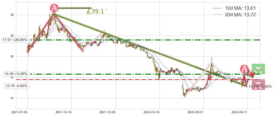 ♘ 阻力价格位14.30,可信任强度56.40%,距离最后交易2022-08-12形成的收盘价格13.84相差 +3.29%